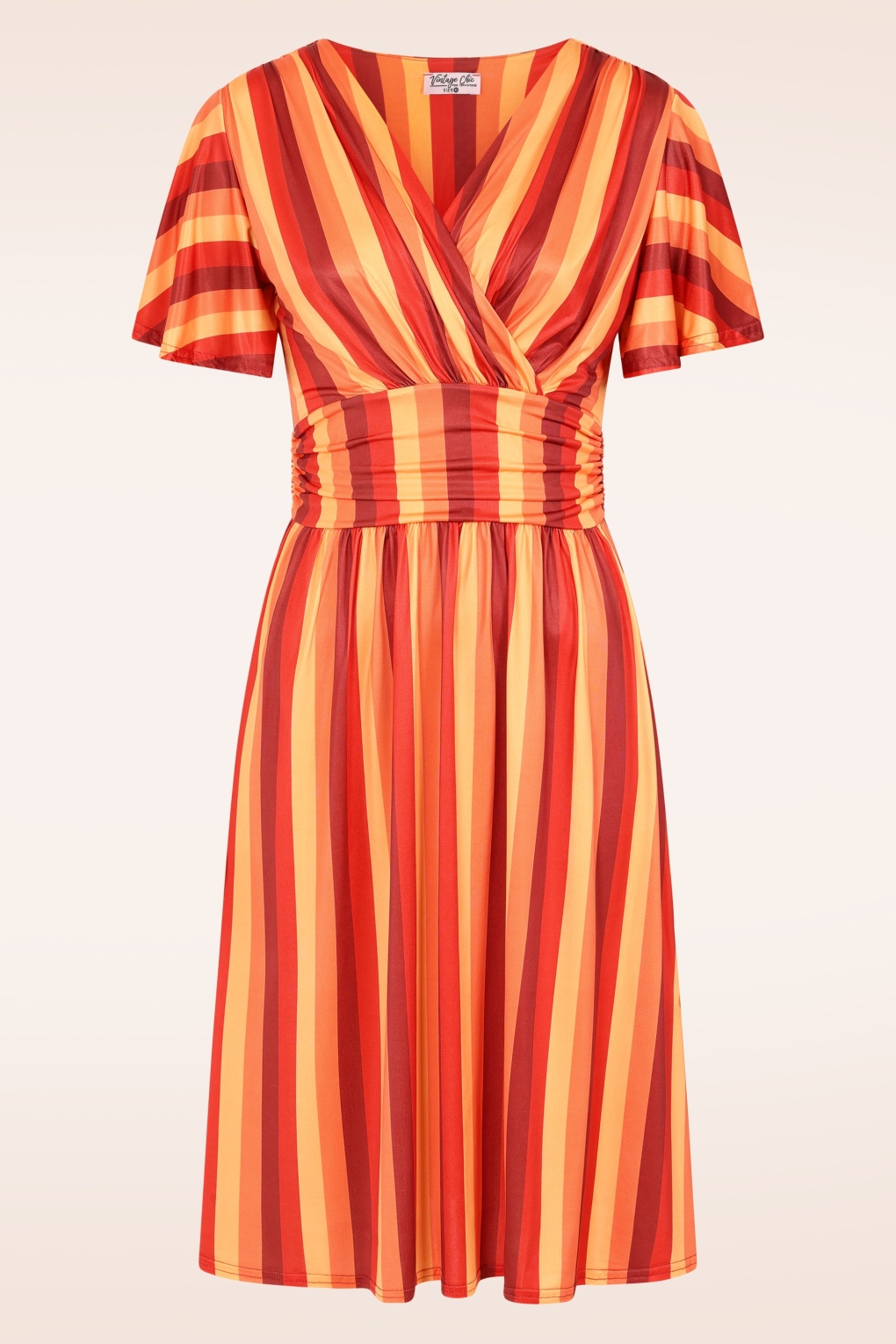 Een echte vintage beauty en perfect voor elke gelegenheid! Sadie heeft een vaste overslag, korte vlindermouwtjes en loopt vanaf de taille uit in een flowy semi-swing rok. Ze is uitgevoerd in een glad, soepel en stretchy slinky stofje met een print van kleurrijke strepen in rood- en oranjetinten, dat heerlijk draagt en niet kreukt. Geniet van de complimentjes die je krijgt zodra je Sadie draagt!   * Semi-swing stijl * Gevoerde top * Vaste overslag * Korte vlindermouwen * Geplooide tailleband * Geen rits of knopen; aantrekken en ready to go! * Valt bij een lengte van 1,70 m over de knie * Exclusief bij Topvintage verkrijgbaar
