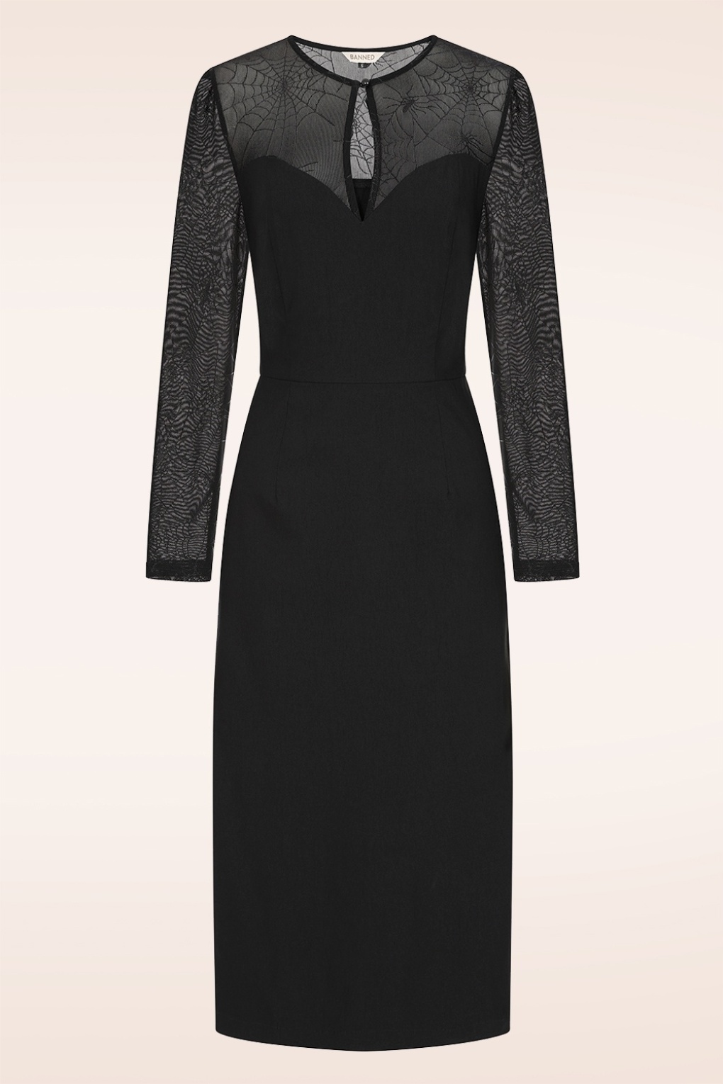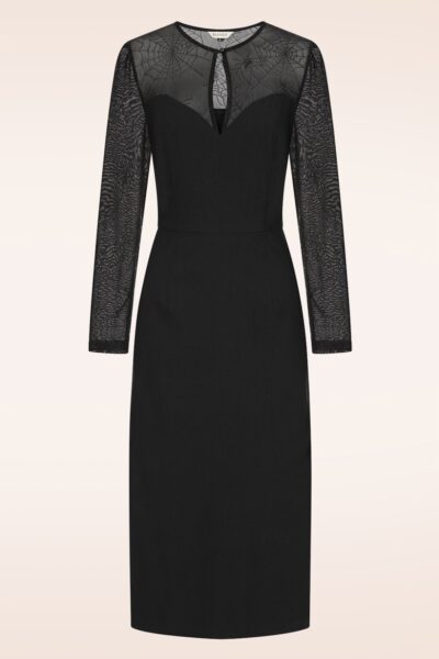 “Spin your web of enchantment.” Deze LBD heeft een aansluitende fit, een sweetheart halslijn met lange mesh mouwen voorzien van een spinnenweb patroon. Uitgevoerd in een stevige, stretchy bengaline- achtige, flatterende stof die heerlijk draagt.    * Pencil model * Sweetheart halslijn met keyhole-detail * Lange mouwen van mesh * Blinde rits met haaksluiting achterzijde * Split achterzijde * Valt bij een lengte van 1,70 m net over de knie